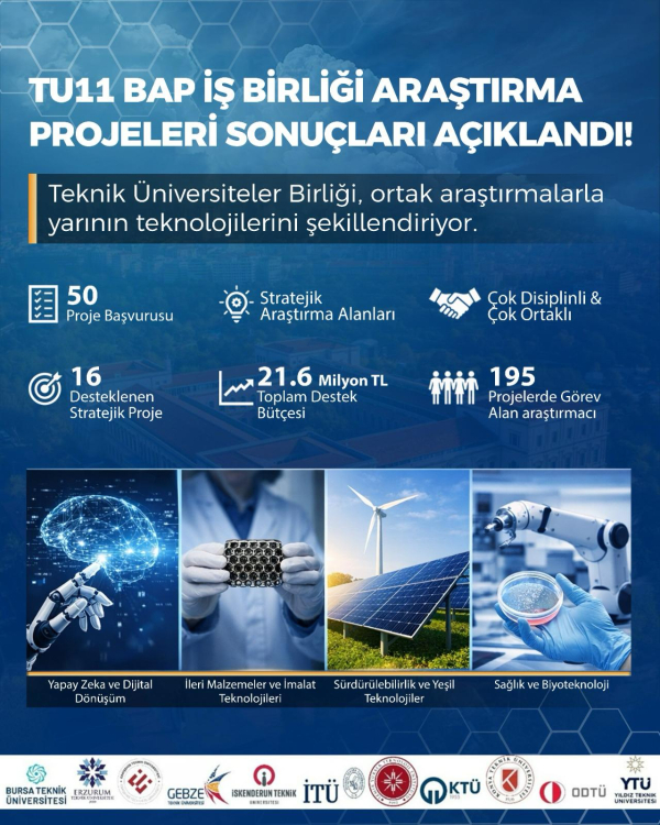 Teknik Üniversiteler Birliği bünyesinde yer alan Bursa Teknik Üniversitesi, Erzurum Teknik Üniversitesi, Eskişehir Teknik Üniversitesi, Gebze Teknik Üniversitesi, İstanbul Teknik Üniversitesi, İzmir Yüksek Teknoloji Enstitüsü, Karadeniz Teknik Üniversitesi, Konya Teknik Üniversitesi, Orta Doğu Teknik Üniversitesi ve Yıldız Teknik Üniversitesi ile birlikte İskenderun Teknik Üniversitesi, TU11 Proje Çağrıları aracılığıyla üniversiteler arası iş birliğini geliştirmeyi ve yüksek teknolojiye dayalı araştırmaları desteklemeyi stratejik bir öncelik olarak görmeye devam ediyor. TU11–2025 sonuçlarıyla elde edilen bu başarı, İskenderun Teknik Üniversitesi’nin mühendislik ve teknoloji alanlarında ulusal ölçekte söz sahibi bir teknik üniversite olma vizyonunu bir kez daha güçlü biçimde ortaya koydu.