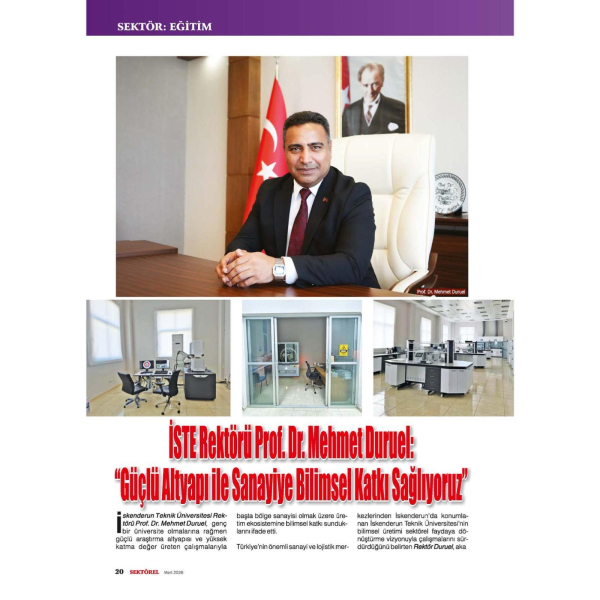 Sanayi, teknoloji ve iş dünyasına yönelik içerikleriyle öne çıkan Sektörel Dergisi’nde, İskenderun Teknik Üniversitesi Rektörü Prof. Dr. Mehmet Duruel’in değerlendirmeleriyle üniversite bünyesinde yürütülen çalışmalar ve güçlü araştırma altyapısı ele alındı.