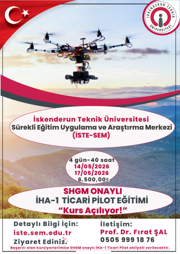 İskenderun Teknik Üniversitesi Havacılık ve Uzay Bilimleri Fakültesi akademisyenleri koordinesinde merkezimizde İHA-1 Ticari Pilot Eğitim kursu açılacaktır. Kurs sonunda başarılı olan kursiyerlere İHA-1 ehliyeti ve Kurs bitirme sertifikası verilecektir. İHA-1 ehliyetini alan kursiyerler 25 kg'a kadar olan hava araçlarını uçurabilme yetkisine sahip olacaktır. 40 saatlik İHA-1 Kurs ücreti KDV dahil 6.500,00 ₺'dir. Kurs, toplam 40 saatlik teorik ve uygulama dersleri şeklinde yapılacaktır. Sivil Havacılık Genel Müdürlüğü (SHGM) web sayfası mevzuat bölümünde güncel SHT-İHA talimatı mevcuttur.