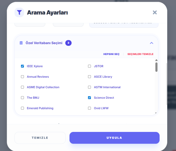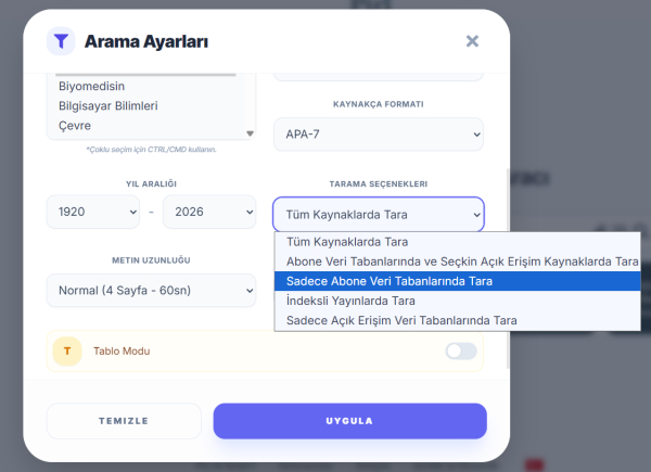 Piri AI, Ayarlar bölümünde “Tarama Seçenekleri” menüsünden “Sadece Abone Veri Tabanlarında Tara” kısmını seçerek, Kütüphanemizin EKUAL Kapsamında ve abonelik sağladığı veri tabanlarında spesifik araştırmalar yapabilirsiniz.
