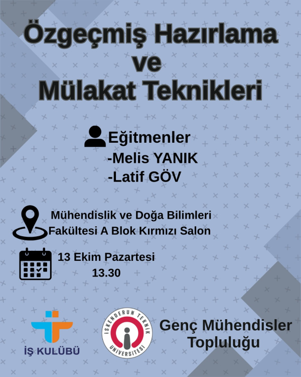 Makine Mühendisliği Bölümü öğrencileri için 13 Ekim 2025 tarihinde saat 13:30'da Mühendislik ve Doğa Bilimler Fakültesi A blok kırmızı salonda Özgeçmiş Hazırlama ve Mülakat Teknikleri ile İlgili seminer verilecektir.