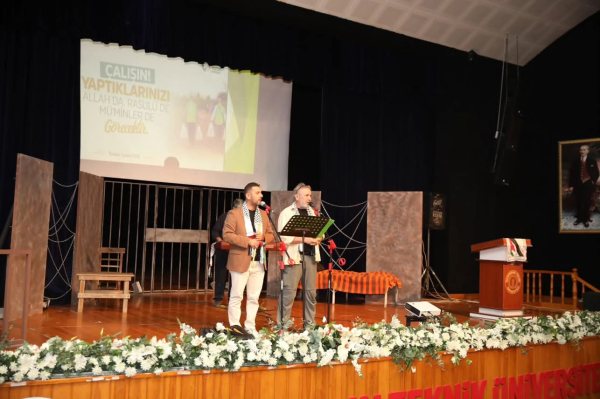 Rektörümüz Prof. Dr. Mehmet Duruel, Üniversitemiz Genç ADEM Topluluğu ve Hatay İHH iş birliğiyle sahnelenen “Benim Adım Filistin” adlı tiyatro oyununa katıldı. Programa Hatay İHH Yönetim Kurulu Başkanı Ahmet Yetim, Genel Sekreterimiz Yılmaz Balaman, İskenderun İlçe Milli Eğitim Müdürü Ali Haytaz, İskenderun İlçe Müftüsü Dr. İhsan İlhan ile birçok STK temsilcisi ve protokol üyesi de katılım gösterdi. Rektörümüz Prof. Dr. Mehmet Duruel, etkinlik sonunda Genç ADEM Topluluğu akademik danışmanı Doç. Dr. Mustafa Küçüktüvek ve oyunun yazarı-yönetmeni Orhan Kuşçu’ya teşekkür ederek şu ifadeleri kullandı: