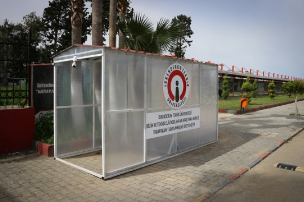 İskenderun Teknik Üniversitesi (İSTE) yeni tip Koronavirüs (COVID-19) Salgını ile mücadele süreçlerine katkı sunmak amacıyla, giysiler üzerindeki bulaş etkisini minimize ederek hijyen sağlamak üzere; “sisleme yöntemi” ile çalışan “Otomatik Dezenfektan Tüneli (Kabini)” üretti. İSTE Bilim ve Teknoloji Araştırma ve Uygulama Merkezi (İSTE-BTM) bünyesindeki laboratuvarlarda tasarımı yapılan ve üretilen tünel, İSTE Merkez Kampüs Girişi’nde devreye alınarak hizmete sunuldu.