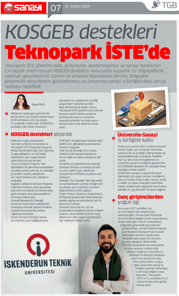 Etkinliğin açılışında konuşan İskenderun Teknik Üniversitesi ve Teknopark İSTE Üniversite-Sanayi İş Birliği Koordinatörü Öğr. Gör. Oğuzhan ARI, KOSGEB desteklerinin girişimciler için sunduğu fırsatlara değinerek, bu tür programların yerel kalkınma ve üniversite-sanayi iş birliğini güçlendirmede kritik bir rol oynadığını vurguladı. Webinar boyunca, girişim destek programlarından Ar-Ge ve inovasyon desteklerine, dijital dönüşümden uluslararası iş birliği fırsatlarına kadar birçok başlıkta katılımcılara rehberlik edildi. Ayrıca etkinlikte, proje yazım süreçleri, başvuru kriterleri ve doğru kaynak planlaması gibi konularda da örnek uygulamalar paylaşıldı. Teknopark İSTE yetkilileri, üniversite olarak bölgesel girişimcilik potansiyelini desteklemeye ve yenilikçi fikirlerin hayata geçirilmesine büyük önem verdiklerini belirterek, bu tür etkinliklerle girişimcilere yön vermeye devam edeceklerinin altını çizdi.