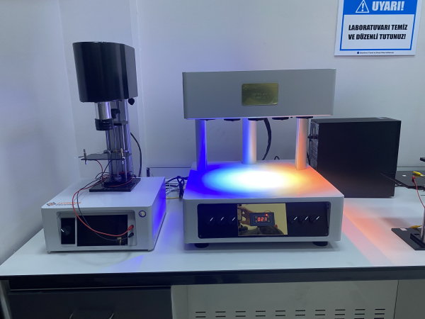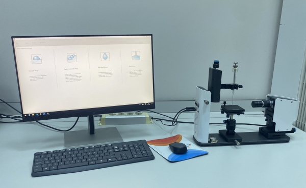Çalışma Prensibi: Cihaz, sıvı bir damlanın katı yüzey üzerine kontrollü olarak bırakılması ve damla geometrisinin yüksek hızlı dijital kamera ile görüntülenmesi esasına dayanır. Elde edilen görüntüler üzerinden temas açısı hesaplanmakta; farklı sıvılar kullanılarak yüzey gerilimi ve serbest yüzey enerjisi analizleri gerçekleştirilmektedir.