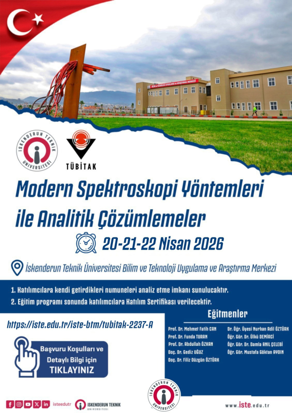 İskenderun Teknik Üniversitesi (İSTE), Bilim ve Teknoloji Uygulama ve Araştırma Merkezi’nde (BTM) düzenlenmesi planlanan “Modern Spektroskopi Yöntemleri ile Analitik Çözümlemeler” başlıklı etkinlik programı, araştırma ve kalite kontrol süreçlerinde kritik rol oynayan spektroskopik analiz tekniklerine yönelik teorik ve uygulamalı bilgi kazandırmayı hedeflemektedir. Eğitim; ICP-MS (İndüktif Eşleşmiş Plazma Kütle Spektrometresi), AAS (Atomik Absorpsiyon Spektrometresi), FTIR (Fourier Dönüşümlü Kızılötesi Spektroskopisi) ve UV Spektrofotometresi olmak üzere, modern spektroskopi cihazlarının teorik ve uygulamalı olarak çalışma prensiplerine, numune hazırlama ve analiz yöntemlerine, veri değerlendirme süreçlerine, farklı bilimsel ve endüstriyel kullanım alanlarına ve bu cihazlarla yürütülen güncel akademik araştırmalara odaklanacaktır.