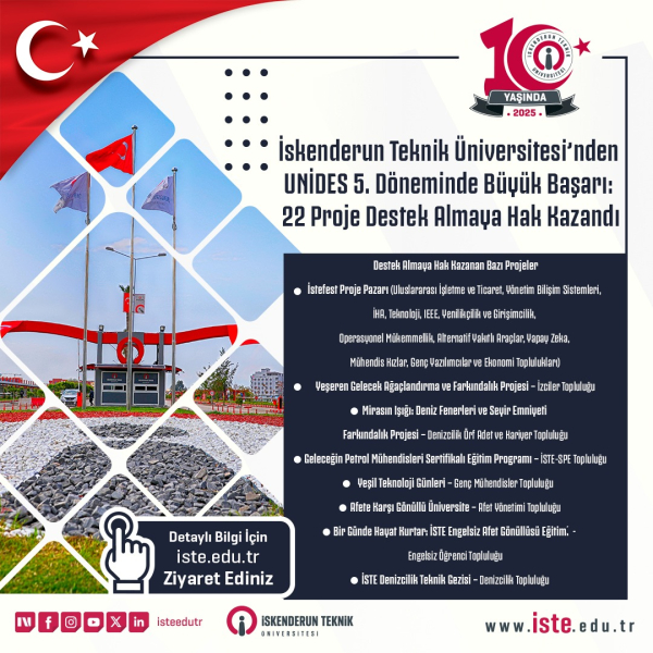 İskenderun Teknik Üniversitesi, bu dönem kabul edilen projeler arasında 22 proje ile öne çıkarak büyük bir başarıya imza attı. İskenderun Teknik Üniversitesi öğrencilerinin hazırladığı projeler; teknoloji, çevre, girişimcilik, afet yönetimi, mühendislik, denizcilik, sosyal farkındalık ve sürdürülebilirlik gibi birçok alanda yenilikçi fikirleriyle dikkat çekti.