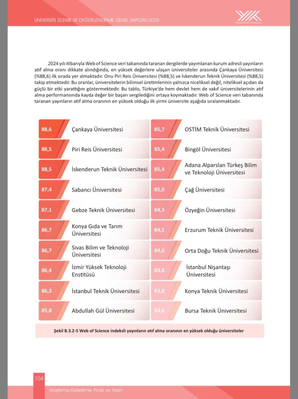 Bilimsel üretimde kaliteyi önceleyen akademik yaklaşımı, nitelikli yayınları ve yükselen araştırma performansıyla dikkat çeken İskenderun Teknik Üniversitesi, Türkiye yükseköğretim sistemi içerisinde önemli bir başarıya daha imza attı. Yükseköğretim Kurulu (YÖK) tarafından hazırlanan “Üniversite İzleme ve Değerlendirme Genel Raporu–2025” yayımlandı. Türkiye genelinde üniversitelerin eğitim-öğretim, araştırma-geliştirme, uluslararasılaşma, sürdürülebilirlik ve topluma hizmet başlıklarında 67 gösterge doğrultusunda değerlendirildiği raporda, İskenderun Teknik Üniversitesi önemli bir başarı elde etti. Rapora göre, Web of Science veri tabanında taranan dergilerde yayımlanan kurum adresli yayınların atıf alma oranı dikkate alındığında, İskenderun Teknik Üniversitesi %88,5’lik oranla Türkiye genelinde üçüncü sırada yer aldı. Bu alanda Çankaya Üniversitesi (%88,6) ilk sırada yer alırken, Piri Reis Üniversitesi (%88,5) ikinci sırada bulundu. İskenderun Teknik Üniversitesi, bu yüksek oranla hem devlet hem de vakıf üniversiteleri arasında öne çıkan üniversitelerden biri oldu.