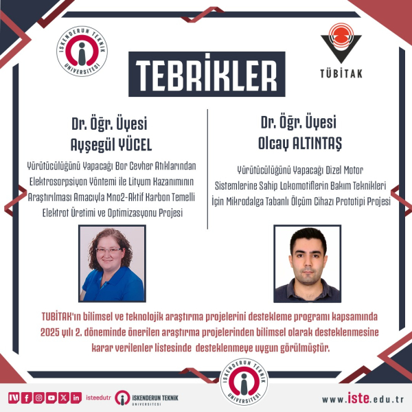 TÜBİTAK Bilimsel ve Teknolojik Araştırma Projelerini Destekleme Programı’nın 2025 Yılı 2. Dönem sonuçları açıklandı. Bilim dünyasına ve Türkiye'nin milli teknoloji hamlesine katkı sunmayı hedefleyen İskenderun Teknik Üniversitesi, sunduğu iki farklı proje ile destek almaya hak kazandı. Kabul edilen projeler, hem enerji depolama sistemleri hem de demir yolu taşımacılığı teknolojileri açısından kritik yenilikler barındırıyor.