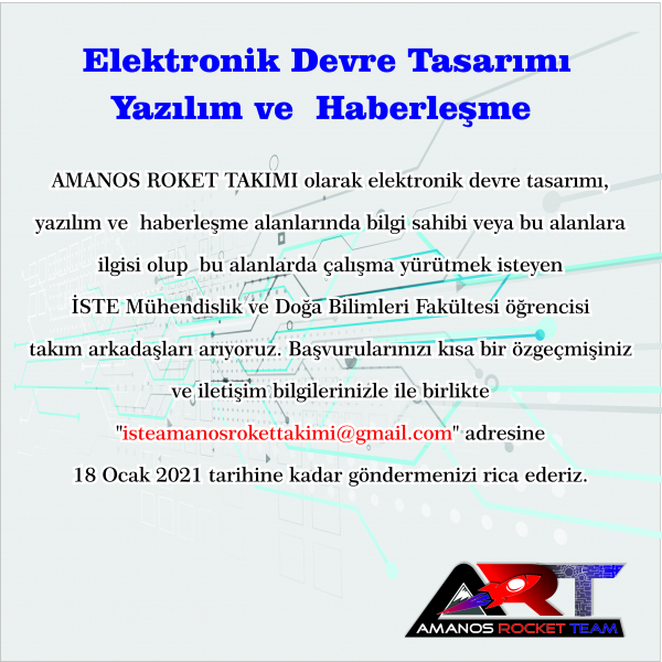 Proje takımımızdaki çalışmalarda aktif olarak rol alacak, elektronik devre tasarımı, yazılım ve haberleşme alanlarında çalışacak takım arkadaşları arıyoruz. Başvurularınızı kısa bir özgeçmiş bilgileriniz ile birlikte "isteamanosrokettakimi@gmail.com" adresine 18 Ocak 2021 tarihine kadar göndermenizi rica ederiz.