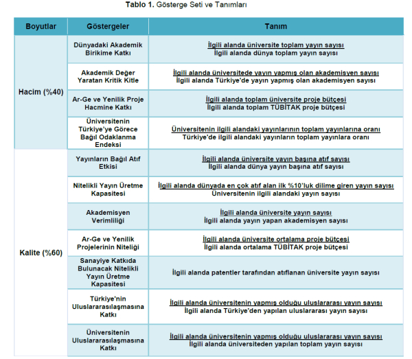 • Üniversitenin ilgili alandaki türkiye’ye görece bağıl odaklanma endeksi