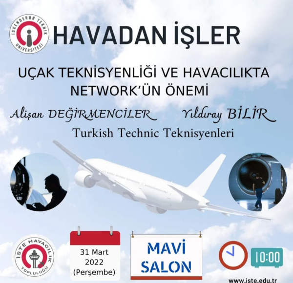 Havacılık Topluluğu tarafından 31 Mart Perşembe günü saat 10.00'da İSTE Mavi Salon'da "Havadan İşler" isimli bir konferans düzenledi. Düzenlenen konferansta Turkish Technic Teknisyenlerinden Alişan DEĞİRMENCİLER VE Yıldıray BİLİR uçak teknisyenliği ve havacılıkta network'ün önemi hakkında öğrencilere bilgi verdi.