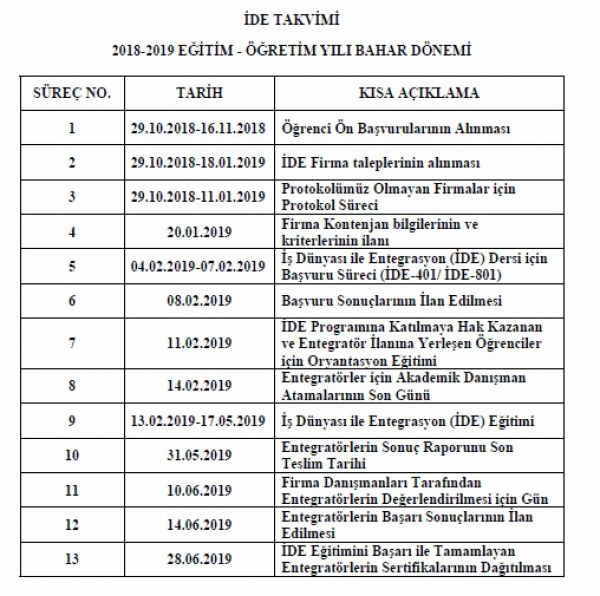 2018-2019 Bahar Dönemi’nde Entegratör olarak İş Dünyası ile Entegrasyon (İDE) Programında yer almak isteyen öğrencilerimizin izlemesi gereken süreçlerle ilgili detaylar aşağıda belirtildiği gibidir.