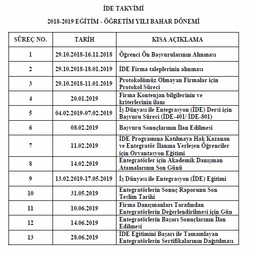2018 -2019 Bahar Dönemi İDE Uygulamasının bitiminde Bölüm İDE Danışmanınıza teslim etmeniz gereken İDE Sonuç Raporu'nun son teslim tarihi 31/05/2019 olup, İDE Notunuz %25 Akademik Danışmanınızın Firma Ziyareti, %25 İDE Sonuç Raporu ve %50 Firma Danışmanınızın değerlendirmesi sonucu olacaktır. Tüm değerlendirmelerin http://app.intorna.com/ adresinden girilerek İNTORNA uygulaması üzerinden yapılması gerekmektedir. İNTORNA giriş bilgilerini hatırlayamayan firma yetklilileri ve danışmanlar için ide@iste.edu.tr adresine e-posta göndermeleri gereklidir.
