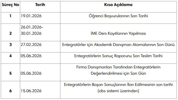 Üniversitemiz 2025/2026 Bahar Dönemi İşletmede Mesleki Eğitim (İME) Takvimi ilan edilmiş olup, gerekli şartları sağlayarak İME programına başvuru yapmak isteyen öğrencilerimizin, ekte sunulan başvuru formunu eksiksiz bir biçimde doldurarak 19.01.2026 tarihine kadar Dr. Öğr. Üyesi Ada YILMAZ'a elden teslim etmeleri ve ilgili belgenin taratılmış halini ada.yilmaz@iste.edu.tr adresine e-posta yoluyla iletmeleri gerekmektedir.