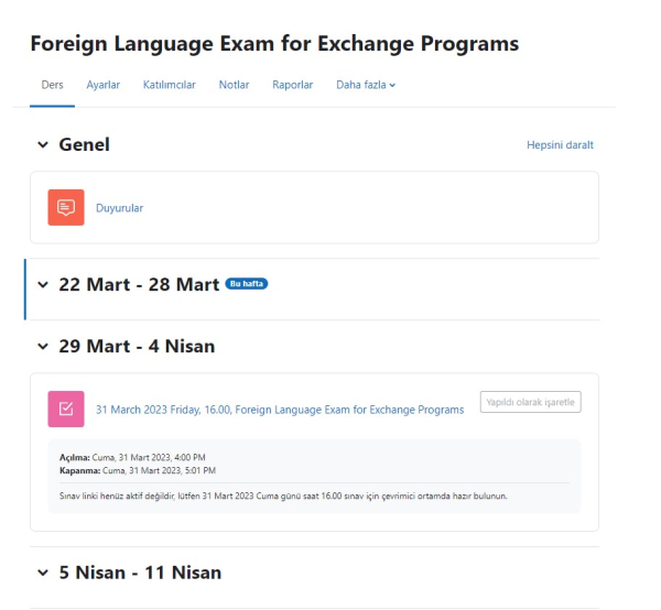 Sınav bu dersin içinde ilgili haftada "29 Mart- 4 Nisan Haftası" sınav linkine ulaşabileceklerdir. Ancak bu link ancak sınavın gerçekleştirileceği 31 Mart 2023 Cuma günü saat 16.00'da aktif hale gelecektir. (örnek olması açısından bir görsel eklenmiştir.)
