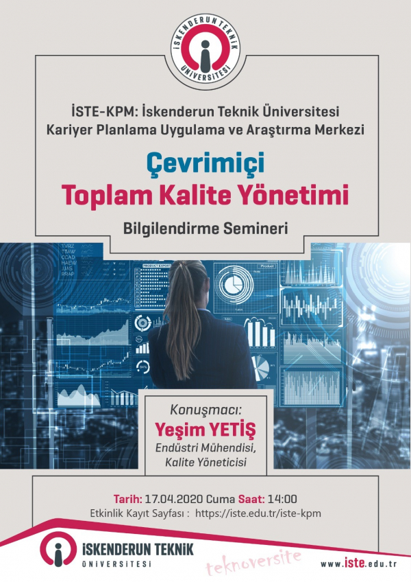 İSTE-KPM siz değerli öğrencilerimizi Endüstri Mühendisi Kalite Yöneticisi Yeşim YETİŞ’in sunacağı “Toplam Kalite Yönetimi” bilgilendirme Semineri’ne davet ediyor.