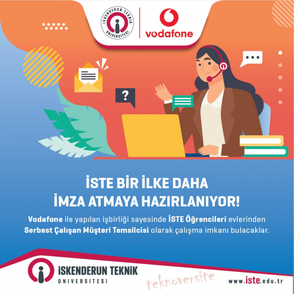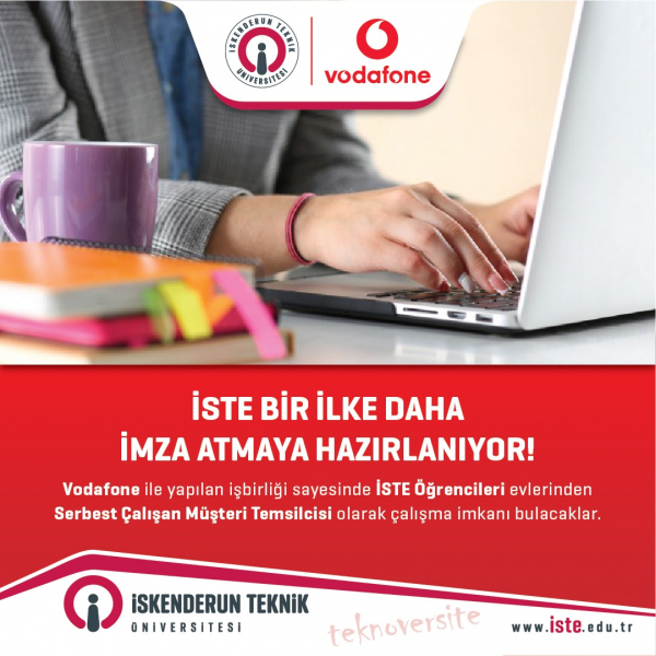 Öğrencilerine yükseköğrenim sürecinde mesleki eğitimlerinin yanında kültürel, sosyal ve sportif anlamda birçok imkân sunan İskenderun Teknik Üniversitesi (İSTE), yeni bir ilke daha imza atmaya hazırlanıyor. Vodafone ile yapılan işbirliği sayesinde İSTE öğrencileri evlerinden serbest çalışan müşteri temsilcisi olarak faaliyet gösterebilecekler.