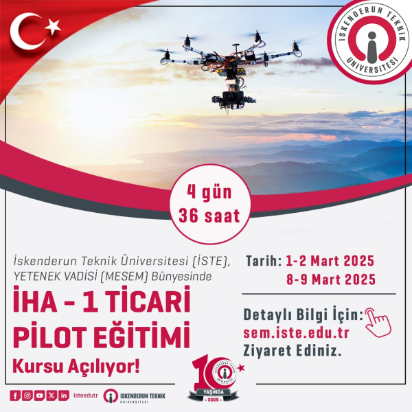 İskenderun Teknik Üniversitesi Havacılık ve Uzay Bilimleri Fakültesi akademisyenleri koordinesinde merkezimizde İHA 1 Ticari Pilot Eğitim kursu açılacaktır. Kurs sonunda başarılı olan kursiyerlere İHA 1 ehliyeti ve Kurs bitirme sertifikası verilecektir. İHA 1 ehliyetini alan kursiyerler 25 kg'a kadar olan hava araçlarını uçurabilme yetkisine sahip olacaktır. 36 saatlik İHA 1 Kurs ücreti KDV dahil 4000 ₺'dir. Kurs, 01-02/03/2025 ve 08-09/03/2025 tarihlerinde toplam 36 saatlik teorik ve uygulama dersleri şeklinde yapılacaktır. Sivil Havacılık Genel Müdürlüğü (SHGM) web sayfası mevzuat bölümünde güncel SHT-İHA talimatı mevcuttur. Kursa kaydolmak için ek'te yer alan formu doldurmanız ve ıslak imzalı bu formu ve form ek'inde talep edilen belgeleri 28/02/2025 tarih ve saat 16.00'a kadar Sürekli Eğitim Merkezi (İSTE-SEM)'ne teslim etmeniz gerekmektedir. Bu eğitime kaydolarak kariyerinizi ve öz geçmişinizi güçlendirebilir, ticari ya da sosyal amaçlı 25 kg'a kadar hava araçlarını uçurabilirsiniz.