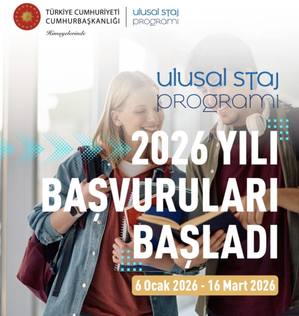 Yükseköğretim öğrencilerinin kamu kurumları ve özel sektör kuruluşlarınca sunulan erken dönem kariyer imkânlarından fırsat eşitliği ve liyakat esaslarına uygun olarak faydalanmasını sağlamak amacıyla, 2020 yılından bu yana yürütülen "Ulusal Staj Programı" 2026 yılı başvuruları 6 Ocak-16 Mart 2026 tarihleri arasında https://ulusalstajprogrami.iskur.gov.tr adresi üzerinden alınacaktır.
