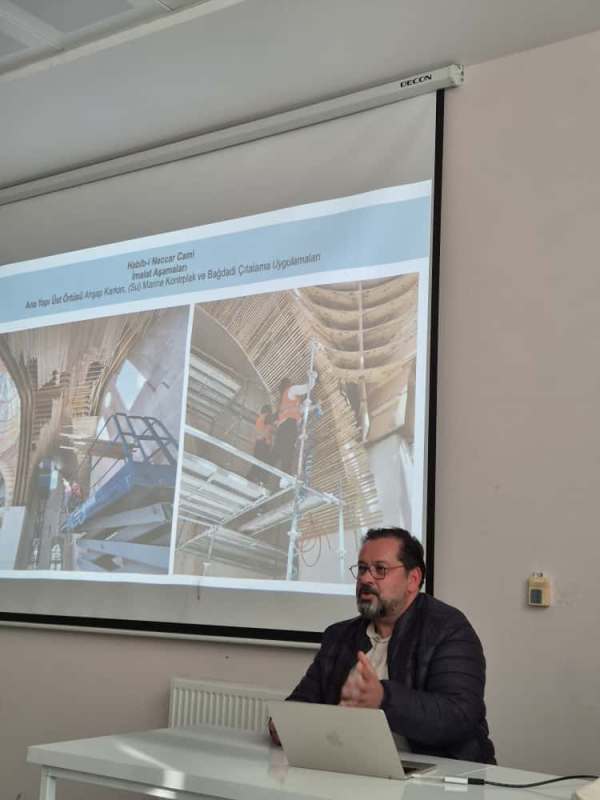 Dersin yürütücüleri Doç. Dr. Mert Nezih Rifaioğlu ve Dr. Öğr. Üyesi Ebru Harman Aslan ile öğrencilerin katılımıyla gerçekleşen sunumda, 6 Şubat 2023 depremlerinde yıkılan Habib-i Neccar Camii’nin rekonstrüksiyon süreci, proje sorumlusu mimar tarafından ayrıntılı olarak aktarılmıştır. Sunumda, yapının hasar tespit çalışmaları, restitüsyon ve rekonstrüksiyon kararlarının geliştirilmesi ile uygulama aşamalarına ilişkin teknik ve bilimsel değerlendirmeler paylaşılmıştır.