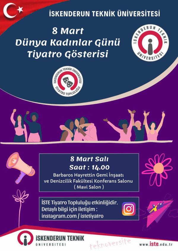 İSTE Tiyatro Topluluğu tarafından 8 Mart Dünya Kadınlar Günü'nün anlam ve önemine yönelik bir tiyatro gösterisi sahnelendi. Etkinlik 8 Mart Salı günü Barbaros Hayrettin Gemi İnşaatı ve Denizcilik Fakültesi Konferans Salonunda (Mavi Salon) gerçekleştirildi. Kadınların günlük hayatlarında karşılaştıkları zorlukları gözler önüne seren gösteri beğeni ile izlendi.