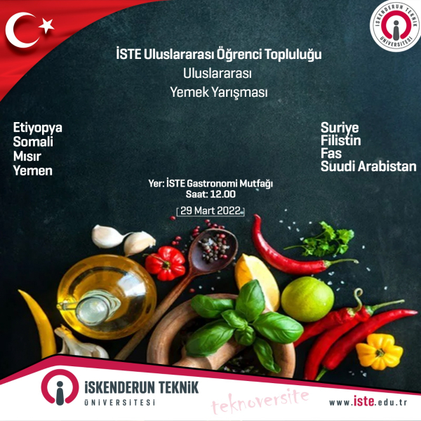 İSTE Uluslararası Öğrenci Topluluğu tarafından düzenlenen "Uluslararası Yemek Yarışmasında"; Somali, Yemen, Fas, Suudi Arabistan, Mısır, Suriye, Filistin, Etiyopya’dan öğrenciler yöresel mutfaklarından yemekler yaparak tanıtımını yaptı. Yarışmada kendi ülkelerinden lezzetlere yer veren öğrenciler yöresel kıyafetleri ile de yarışmaya renk kattı. Gastronomi ve Mutfak Sanatları Bölümü tarafından değerlendirilen yemeklerden Filistin, Suriye ve Etiyopya ilk üçe girmeye hak kazandı. Yarışmanın ardından İSTE Rektörü Prof. Dr. Tolga Depci ile bir araya gelen öğrencilerle bie araya gelerek sorunlarını dinledi.