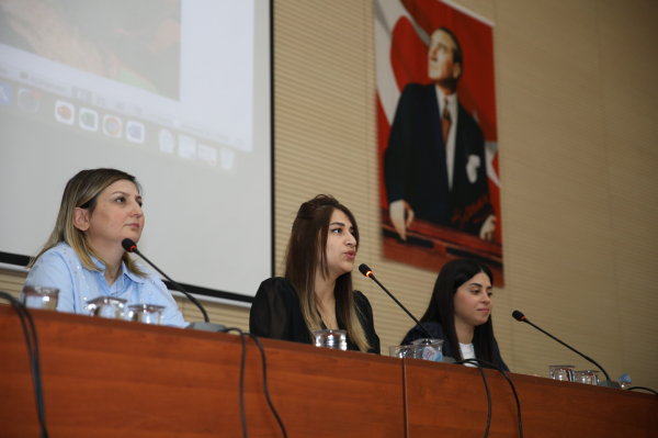 The panel named "Support for Women's Psychological and Professional Recovery Processes After the Earthquake" was held within the program. The panelists included ISTE Faculty Member Assoc. Dr. Emine Vasfiye Korkmaz, Psychologist Uğur Sekiçoğlu from Sevgi Psychology Counseling Center, Psychologist Dilek Yıldırım from İskenderun Social Services Directorate, and Özgün Durgun from İskenderun İŞKUR Center. They discussed the difficulties that women face in their daily lives, particularly during and after the earthquake. They also shared their research findings and experiences related to the recovery process with the audience. Assoc. Prof. Dr. Korkmaz talked about the results of their research conducted with 42 women entrepreneurs who continued their activities after the earthquake in Iskenderun. She touched on various topics such as the cultural and traditional influence, infections, reproductive health problems, violence against women, and problems related to business life. Psychologist Sekiçoğlu discussed the psychological, social, and economic situations of women in the post-earthquake period. He also shared his experiences about post-traumatic recovery and socialization processes for women. Psychologist Yıldırım congratulated all women on Women's Day. She also explained the services provided by the Ministry of Family and Social Policies and how to access these services Finally, Durgun, the İŞKUR İskenderun representative, talked about the "İş Pozitif" project and provided information on ministry-sponsored opportunities and application procedures that support women's employment.