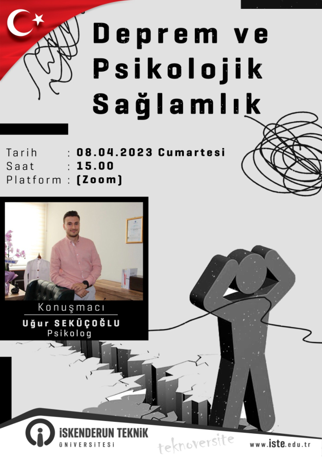 : Psikolog Uğur Seküçoğlu’nun konuk olarak katılacağı, ‘Deprem ve Psikolojik Sağlamlık’ konulu program 8 Nisan 2023 Cumartesi günü saat 15.00’da 'Zoom' üzerinden gerçekleşecektir.