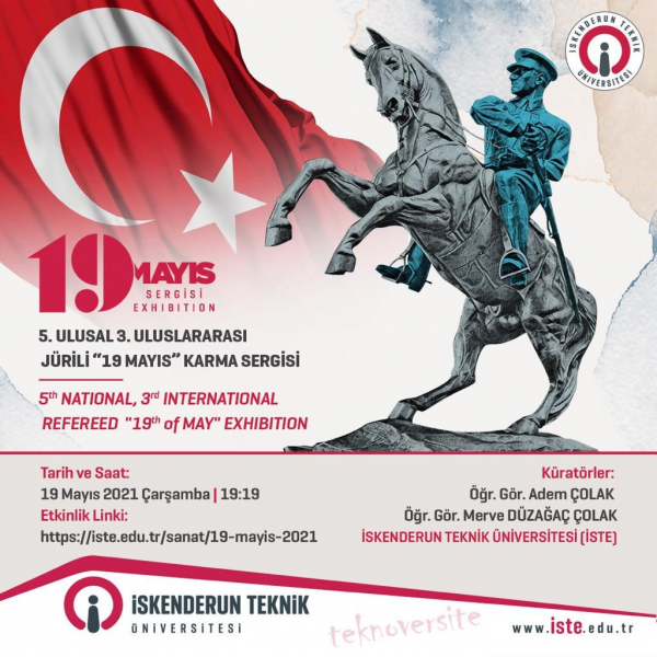 İskenderun Teknik Üniversitesi (İSTE) Rektörü Prof. Dr. Tolga Depci’nin Onursal Başkanlığını, İskenderun Meslek Yüksekokulu (İMYO) El Sanatları Bölümü öğretim elemanlarından Öğr. Gör. Adem Çolak ve Öğr. Gör. Merve Düzağaç Çolak’ın etkinlik koordinatörlüğünü ve sergi küratörlüğünü yaptığı V. Ulusal ve III. Uluslararası Jürili 19 Mayıs Karma Sergisi çevrimiçi olarak 19 Mayıs Çarşamba günü saat 19:19’da ziyarete açılmıştır.