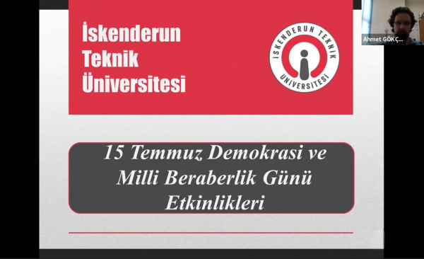İskenderun Teknik Üniversitesi’nde (İSTE) 15 Temmuz Demokrasi ve Milli Birlik Günü Anma Etkinlikleri kapsamında bir hafta boyunca devam eden etkinlikler tamamlandı. Son gün etkinliklerinin ilkinde İskenderun Teknik Üniversitesi Bilgisayar Mühendisliği Dr. Öğr. Üyesi Ahmet Gökçen saat 10.00’da Türkiye Geçilmez isimli webinar gerçekleştirdi. Webinarda ilk olarak 15 Temmuz’la ilgili hazırladığı videoyu gösteren Gökçen, o gece vatanı uğruna canını feda etmiş tüm şehitlerimizi rahmet ve minnet ile andı. Haberleşme, yazılım, telekomünikasyon, İHA ve SİHA’lar, otomobil, aşı gibi pek çok farklı alanda yerlileşmenin önemine değinen Gökçen, ülkemizde son yıllarda bu alanlarda atılan adımlar ve yaşanan gelişmeler ile ilgili bilgi verdi.