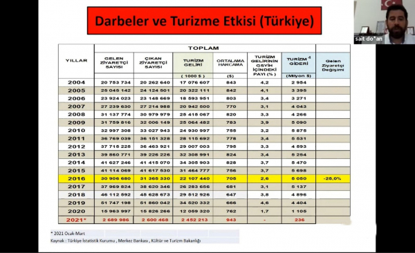 16 Temmuz Cuma günü gerçekleştirilen son etkinlikte, İSTE Turizm Fakültesi Dekan Yardımcı Dr. Öğr. Üyesi Sait Doğan, Darbeler ve Turizm başlıklı çevrimiçi söyleşisinde turizm ve darbe kavramlarını ele alarak bu kavramların birbiriyle ilişkisini ele aldı. Dünyada 2000 sonrası yaşanan darbe ve darbe girişimlerinin ülke ekonomilerine ve turizm gelirlerine yansımalarını inceleyen Doğan, 15 Temmuz darbe girişiminin ülkemizin turizm gelirlerine etkilerini açıkladı. Darbe girişimi sonrasında yerli ve yabancı turistlerin davranışlarını istatistiksel olarak irdeleyen Doğan, turizm için güvenliğin gerekliliğini vurguladı.