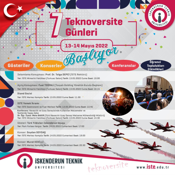 İskenderun Teknik Üniversitesi’nin (İSTE) kurulduğu yıldan bu yana her yıl düzenlediği ve tescili İSTE’ye ait olan TeknoversiteGünleri’nin yedincisi 13-14 Mayıs tarihleri arasında İskenderun Teknik Üniversitesi Merkez Kampüste gerçekleştirilecek. İki gün sürecek olan Teknoversite Günleri’nde öğrenciler girişimcilik ve teknolojiye dair pek çok önemli konuda alanında uzman kişilerle bir araya gelme fırsatı bulacak, gökyüzündeki Milli Takımımız Türk Yıldızları’nın gösterisini izleyecek ve konserlerde gönüllerince eğlenecek.