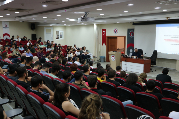 Eğitimin ikinci oturumunda Doç. Dr. Hakan Eryüzlü proje yazma sürecinin nasıl ilerlediğini, öğrencilerin nelere dikkat etmesi gerektiğini, projelerin kabul edilme ve reddedilme nedenlerinin neler olabileceğini anlattı. Öğrencilerden gelen soruları Doç. Dr. Kumruoğlu ve Doç. Dr. Eryüzlü birlikte cevapladı.
