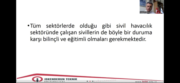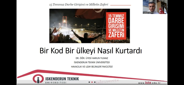 İskenderun Teknik Üniversite’nde (İSTE) 15 Temmuz Demokrasi ve Milli Birlik Günü Anma Etkinlikleri kapsamında çevrimiçi etkinlikler düzenleniyor. İlk gün etkinliklerinde İskenderun Teknik Üniversitesi (İSTE) Havacılık ve Uzay Bilimleri Fakültesi öğretim üyesi Dr. Öğr. Üyesi Harun Yılmaz saat 13.30’da “Bir Kod Bir Ülkeyi Kurtardı” isimli bir konferans verdi. Konferansına Mustafa Kemal Atatürk’ün Gençliğe Hitabesi ile başlayan Dr. Yılmaz, Türkiye’de darbelerin tarihine kısaca değinerek 15 Temmuz gecesinde yaşananlara değindi. 15 Temmuz gecesi Cumhurbaşkanı Recep Tayyip Erdoğan’ın Dalaman’dan İstanbul’a geliş sürecini anlatan Dr. Yılmaz, havacılıkta kullanılan uçak ve helikopterlerin son teknoloji olmasının çok önemli olması gerektiğini ifade ederek, araçların kontrolünün ülke otoritesinde olması için sistemlere ihtiyaç duyduğunun altını çizdi.