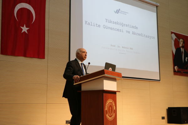 Programda daha sonra Yükseköğretim Kalite Kurulu Başkanı Prof. Dr. Muhsin Kar “Yükseköğretimde Kalite Güvencesi ve Akreditasyon” konulu bir konferans verdi. YÖKAK Başkanı Prof. Dr. Kar yapmış olduğu sunumda öncelikle kalite güvencesinin artan önemine ve modern bir kavram olarak kalite kavramına değindi. Kalitenin çok boyutlu bir kavram olduğunun altını çizen YÖKAK Başkanı Prof. Dr. Kar, nitelik farklılıklarının artmasının kalite kavramının öneminin artışına neden olduğunu belirtti. Sunumunda daha sonra paydaşların kalite algısına; yükseköğretimde kalite güvencesine; kalite güvence sistemleri ve YÖKAK’ın kalite güvencesi çerçevesine; kalite güvencesi ve akreditasyon uygulamaları konularını ele alan YÖKAK Başkanı Prof. Dr. Kar, mükemmeliyete yolculukta her kurumun özel olduğunu ifade etti. Kendine özgü yeterliklerin geliştirilerek YÖKAK şartlarını sağlayan kendine özgü modeller geliştirebileceğini belirten Prof. Dr. Kar, bu durumun sürdürülebilirlik açısından da kıymetli olduğunun altını çizdi. Sunumunda ayrıca YÖKAK ölçütlerinin uluslararası uyumuna; YÖKAK dış değerlendirme türlerine ve kalite güvencesinin hedeflerine değinen Prof. Dr. Kar, YÖKAK ve akreditasyon ajanslarının gündemini aktararak konferansını noktaladı.