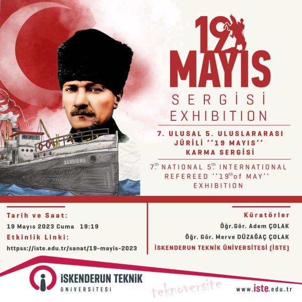 İskenderun Teknik Üniversitesi (İSTE) Rektörü Prof. Dr. Tolga Depci’nin Onursal Başkanlığını, İskenderun Meslek Yüksekokulu (İMYO) El Sanatları Bölümü öğretim elemanlarından Öğr. Gör. AdemÇolak ve Öğr. Gör. Merve Düzağaç Çolak’ın etkinlik koordinatörlüğünü ve sergi küratörlüğünü yaptığı 7. Ulusal ve 5. Uluslararası Jürili 19 Mayıs Karma Sergisi çevrimiçi olarak 19 Mayıs Cuma günü saat 19:19’da ziyarete açıldı. Geleneksel olarak düzenlenen 19 Mayıs Karma Sergisine bu sene Türkiye, Moldova, Kırgızistan, Özbekistan, Mısır, Polonya ve İran’dan sanatçılar yoğun ilgi gösterdi. Karma sergide bu yıltezhip, minyatür, hat, keçe, dokuma, heykel, resim, grafik, deri ve baskı gibi birçok türde eser yer aldı.