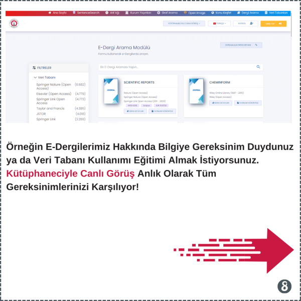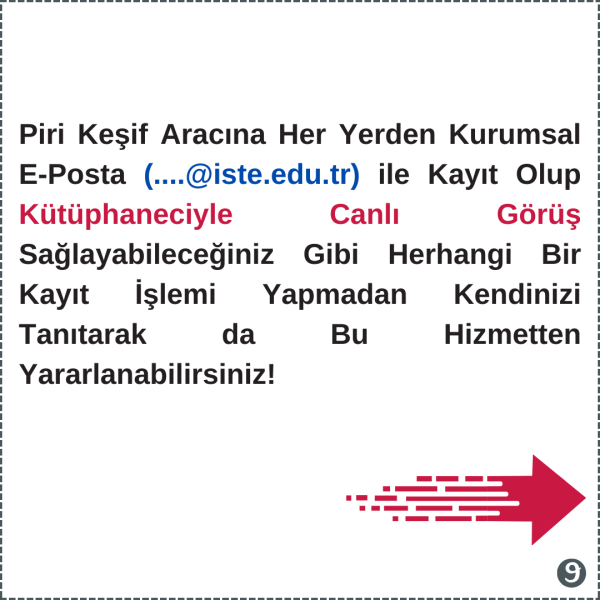 İskenderun Teknik Üniversitesi (İSTE) Kütüphane ve Dokümantasyon Daire Başkanlığı “Kütüphaneciyle Canlı Görüş” hizmetini uygulamaya başladı. Kütüphane İSTE: BKM, akademik yayın arama süreçleri başta olmak üzere tüm kütüphane hizmetlerinden anlık yazılı, sözlü ve görüntülü görüşme olanağı sağlayan “Kütüphaneciyle Canlı Görüş” hizmeti ile kullanıcıya kolaylık imkânı sağlayacak. İSTE’nin, kütüphane kullanıcı hizmet trafiğini geliştirme ve yönetme çalışmaları kapsamında uygulamaya başladığı sisteme, kullanıcılar Piri Keşif Aracı üzerinden (https://kesifaraci.com/?modul=live_chat&uid=iste.edu.tr) diledikleri yerden bağlanıp kullanabilecek.