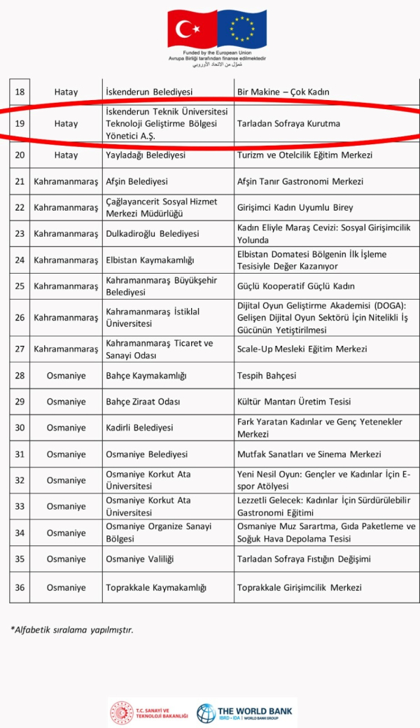 İskenderun Teknik Üniversitesi (İSTE) Teknoloji Geliştirme Bölgesi Yönetici A.Ş.’nin projesi SEECO Proje Teklif Çağrısı kapsamında yapılan değerlendirme sonucuna göre Tarladan Sofraya Kurutma Projesiyle “Tam Başvuru” aşamasına devam etmeye hak kazandı.
