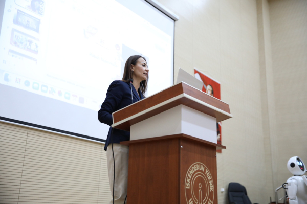 Kadın Girişimciler Topluluğu olarak hazırladıkları Robot Teammate etkinliğine katılımlarından dolayı herkese teşekkür ederek söze başlayan Doç Dr. Aytemis Depci ise, “Topluluğumuzu, kendini geliştirmeye açık ve girişimci olmak isteyen tüm İskenderun Teknik Üniversitesi kadın öğrencilerimizin teknolojinin desteği ile girişimcilik ve gelir yaratma becerilerini hayata geçirebilmeleri için yol göstermek amacıyla kurduk. Hayallerindeki girişimcilik projelerini gerçekleştirmek isteyen öğrencilerimize temel bilgi, danışmanlık ve eğitimleri alabilmeleri için akademisyenlerimizin ve TOBB Hatay Kadın Girişimciler Kurulunun değerli destekleri ile yol göstermeyi hedefliyoruz. Bugün de Robot İstihdam Ajansı Kurucusu Canan Alkın bizlerle yapay zekâ ve robot teknolojilerine ilişkin değerli bilgiler paylaştı. Kendisine üniversitemize geldiği için huzurlarınızda tekrar teşekkür ederim” ifadelerini kullandı.