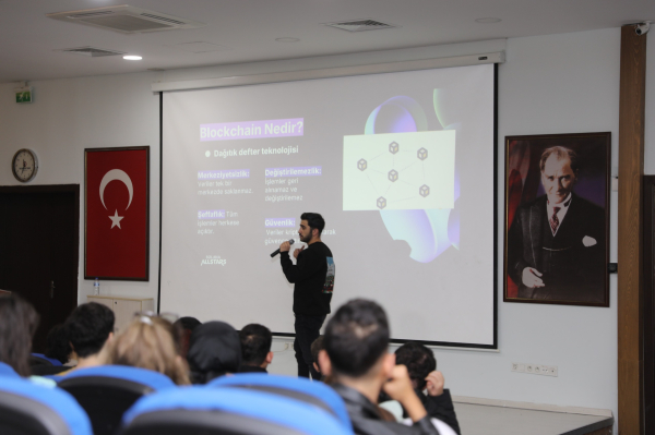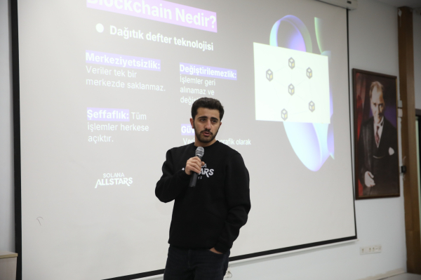 Söyleşiye konuşmacı olarak ise alanında uzman Solana Allstars Türkiye Bölge Müdürü ve aynı zamanda öğrenci olan Muhammed EKİCİ katıldı. EKİCİ, öncelikle Blockchain teknolojisi ve Solana ekosistemi üzerine bilgilendirici bir sunum yaptı. Blockchain teknolojisinin nasıl çalıştığı, güvenliği, kullanım alanları ve özellikle Solana ekosisteminin sunduğu fırsatları detaylı bir şekilde ele alan EKİCİ, Blockchain Teknolojisi’nin sadece kripto para birimlerinden ibaret olmadığını, finans, sağlık, lojistik gibi birçok sektörde nasıl devrim yaratabileceğinden bahsetti.