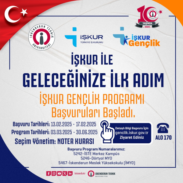 T.C. Türkiye İş Kurumu Genel Müdürlüğü Hatay Çalışma ve İş Kurumu İl Müdürlüğü ve İskenderun Teknik Üniversitesi (İSTE) iş birliğiyle düzenlenecek olan ‘İŞKUR Gençlik Programı’ başvuruları için tarih aralığı belirlendi. Toplamda 383 kişi için ayrılan kontenjanın 358’i İSTE Merkez Kampüsü, 15’i Dörtyol MYO ve 10’u İSTE MYO için ayrıldı. Başvurular, 13 Şubat 2025 ile 17 Şubat 2025 tarihleri arasında e-Devlet, ALO 170 ve e-Şube üzerinden yapılabilecektir.