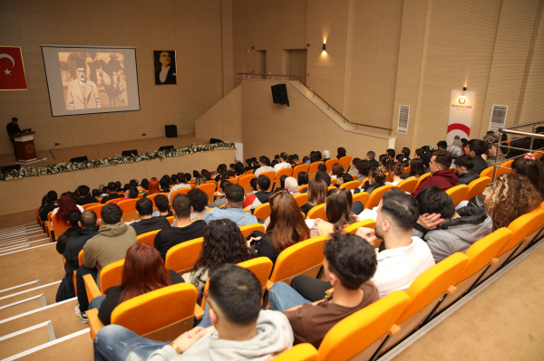 Saygı Duruşu ve İstiklal Marşı’nın okunmasıyla başlayan etkinliğe ilgi yoğundu. Konferansta, Mehmet Akif ERSOY’un hayatını anlatan bir video gösteriminin ardından, konuşmacı olarak yer alan Öğr. Gör. Nuh KAHRAMANOĞLU’nun sunumuna geçildi. Öğr. Gör. KAHRAMANOĞLU, “İstiklal Marşını Yeşerten İklim” başlıklı sunumunda, İstiklal Marşı’nın yazılışı ve kabulünün tarihi sürecinin yanı sıra, marşın yazılmasına etki eden sosyal ve ruhsal iklimi ele aldı. KAHRAMANOĞLU, Mehmet Akif ERSOY’un, marşını yazarken yaşadığı dönemin zorluklarını ve milletin bağımsızlık mücadelesine duyduğu inancı vurguladı. Ayrıca, AKİF’in marşın yazılmasındaki motivasyonunu, milletin kararlılığı, cesareti ve ümidiyle özdeşleştirerek, İstiklal Marşı’nın sadece bir şiir değil, aynı zamanda milletin özüdür, dedi. KAHRAMANOĞLU, sunumunda ayrıca İstiklal Marşı’nın sadece bir şiir olmadığını, aynı zamanda milletin ortak değerlerinin, inancının ve direncinin sembolü olduğunu belirterek, AKİF’in “Bu marş bir daha yazılamaz” sözünü hatırlattı ve milletin ortak ruhunu simgeleyen bu eserin, her zaman hatırlanması gereken bir miras olduğunu ifade etti.