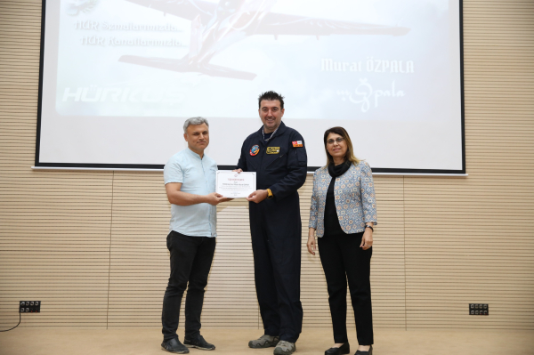 Öğrencilerle mesleki deneyimlerini paylaşan ÖZPALA, havacılık sektörünün dinamiklerine ve test pilotluğunun kritik rolüne dikkat çekti. Konuşması sırasında Hürkuş projesindeki uçuş deneyimlerini aktaran ÖZPALA, gerçekleştirdiği test uçuşlarını görseller ve videolar eşliğinde sunarak katılımcılara unutulmaz anlar yaşattı. ÖZPALA’nın sunumu, gençlerin havacılık alanındaki heyecanını ve motivasyonunu daha da artırdı. Programın son bölümünde öğrenciler, ÖZPALA’ya yönelttikleri sorularla kariyer planlamaları ve havacılık sektörü hakkında değerli bilgiler edinme fırsatı buldu. Program, değerli bilgi ve deneyimlerini katılımcılarla paylaşarak etkinliğe katkıda bulunan Hürkuş Test Pilotu Murat ÖZPALA’ya teşekkür belgesi takdim edilmesinin ardından günün anısına çekilen toplu fotoğraf ile sona erdi.