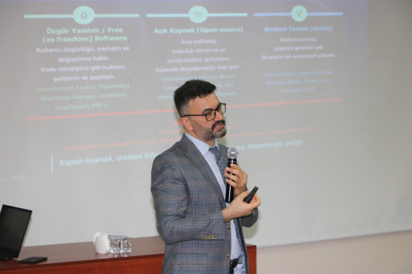 Açılış konuşmasının ardından panelin ilk sunumunu EHSİM Kurumsal Yönetim ve Gelişim Direktörü Dr. İbrahim USLU gerçekleştirdi. “Yerli Savunma Sanayiinde İleri Teknolojiler ve Kariyer Fırsatları” başlıklı sunumunda USLU, savunma sanayinin mevcut durumu, EHSİM’in faaliyet alanları, ürün ve çözümleri ile genç mühendisler için kariyer ve staj imkânları hakkında bilgi verdi. USLU, “Savunma sanayi neferi olmak bir meslek değil, bir misyondur.” diyerek gençlere önemli mesajlar verdi. Panelin ikinci konuşmacısı EHSİM Sistem ve Test Mühendisliği Direktörü Dr. Mert SERKAN oldu. “Elektronik Harpte Yenilikçi Yaklaşımlar ve Milli Projeler” başlıklı sunumunda SERKAN, yerli ve milli radar sistemlerinden, elektronik harp teknolojilerinden, simülatör altyapılarından ve savunma sanayinin geleceğine yön verecek sistem mühendisliği bileşenlerinden söz etti. Son olarak EHSİM Bilgi İşlem Birim Yöneticisi Dr. Mustafa YENİAD, “Özgür ve Açık Kaynak Yazılımların Ulusal Bağımsızlıktaki Rolü” başlıklı sunumunu yaptı. YENİAD, dijital egemenliğin önemine vurgu yaparak, “Kaynak koduna sahip olmayan ülkeler, dijital kaderine de sahip olamaz.” ifadelerini kullandı. Ayrıca açık kaynak yazılımların güvenlik, siber egemenlik ve stratejik bağımsızlık açısından taşıdığı öneme değindi.