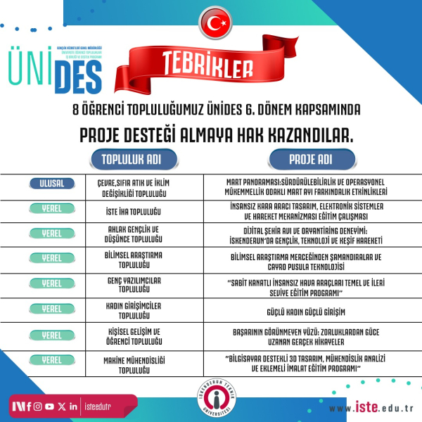 Gençlik ve Spor Bakanlığı tarafından üniversite öğrencilerinin sosyal, kültürel ve akademik gelişimlerine katkı sunmak, topluluk faaliyetlerini teşvik etmek ve gençlerin proje üretme kapasitelerini artırmak amacıyla yürütülen program kapsamında yapılan değerlendirmeler sonucunda, İSTE öğrenci topluluklarının hazırladığı projeler önemli bir başarı elde etti. Yapılan değerlendirme sürecinin ardından İSTE öğrenci toplulukları tarafından hazırlanan projelerden 1’i ulusal, 7’si ise yerel kategori kapsamında desteklenmeye uygun bulundu. Böylece İskenderun Teknik Üniversitesi öğrencileri, geliştirdikleri projelerle hem üniversite içinde hem de toplumla etkileşim kuran faaliyetlere imza atma fırsatı yakaladı.