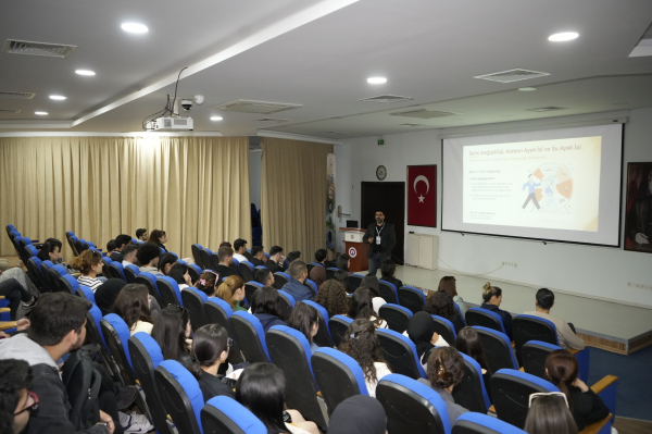 Program kapsamında konuşmacı olarak yer alan Prof. Dr. Abdulla SAKALLI, ilk oturumda gerçekleştirdiği “İklim Değişikliği, Karbon ve Su Ayak İzi” başlıklı sunumunda iklim değişikliğinin temel nedenleri ve küresel etkilerine değindi. Sunumunda iklim sistemi bileşenleri, küresel ısınma mekanizması, dünya genelinde ve Türkiye’de gözlenen iklim değişikliği etkileri ile ekonomik ve endüstriyel sonuçlar hakkında kapsamlı bilgiler paylaşan SAKALLI; ayrıca karbon ayak izinin tanımı, önemi ve hesaplanma süreçleri ile karbon yönetimi ve azaltım stratejileri üzerinde durdu. SAKALLI, su ayak izi kavramını da ele alarak su ayak izinin hesaplanması, sanayide su ve enerji döngüsü ile su tüketimini azaltmaya yönelik stratejiler hakkında katılımcıları bilgilendirdi.